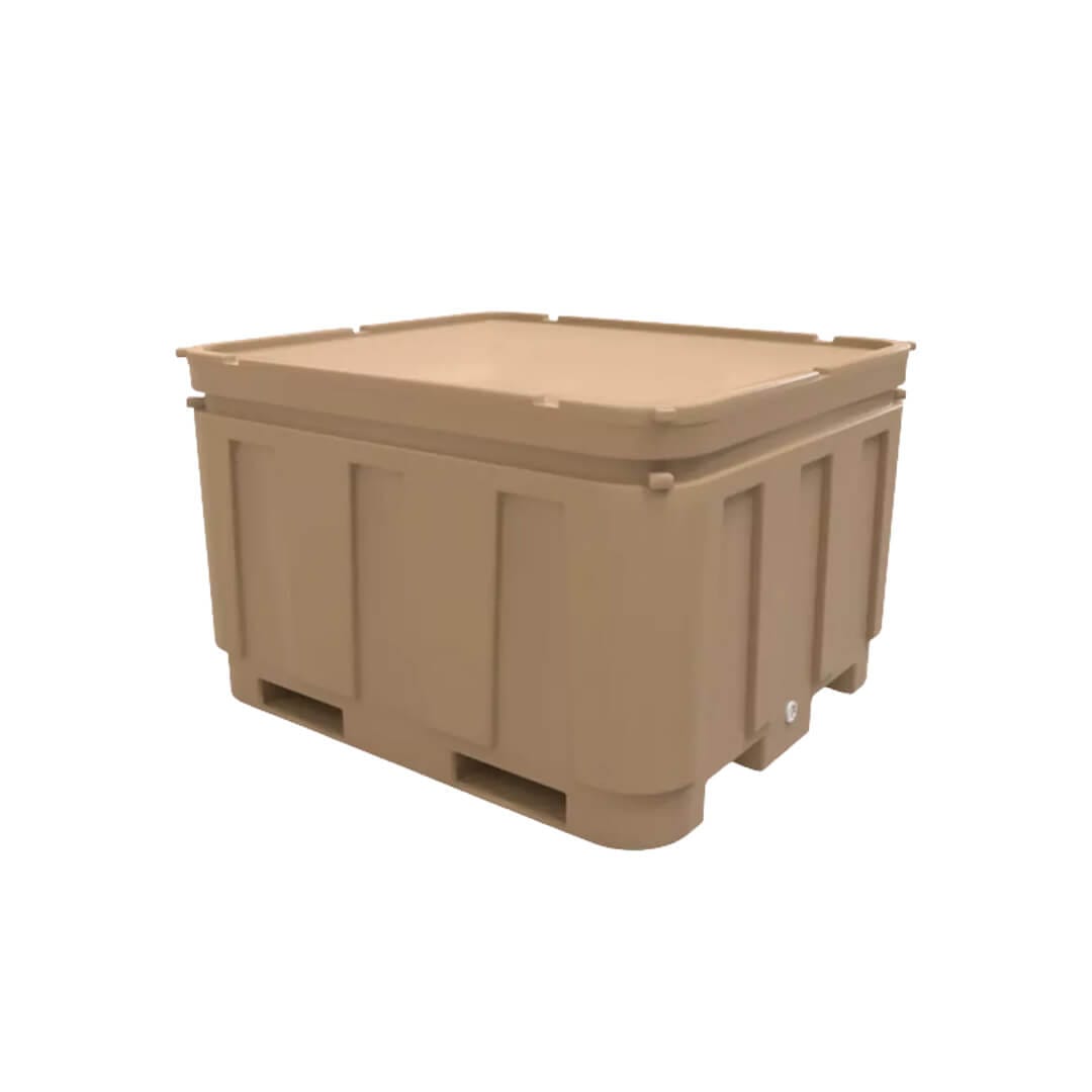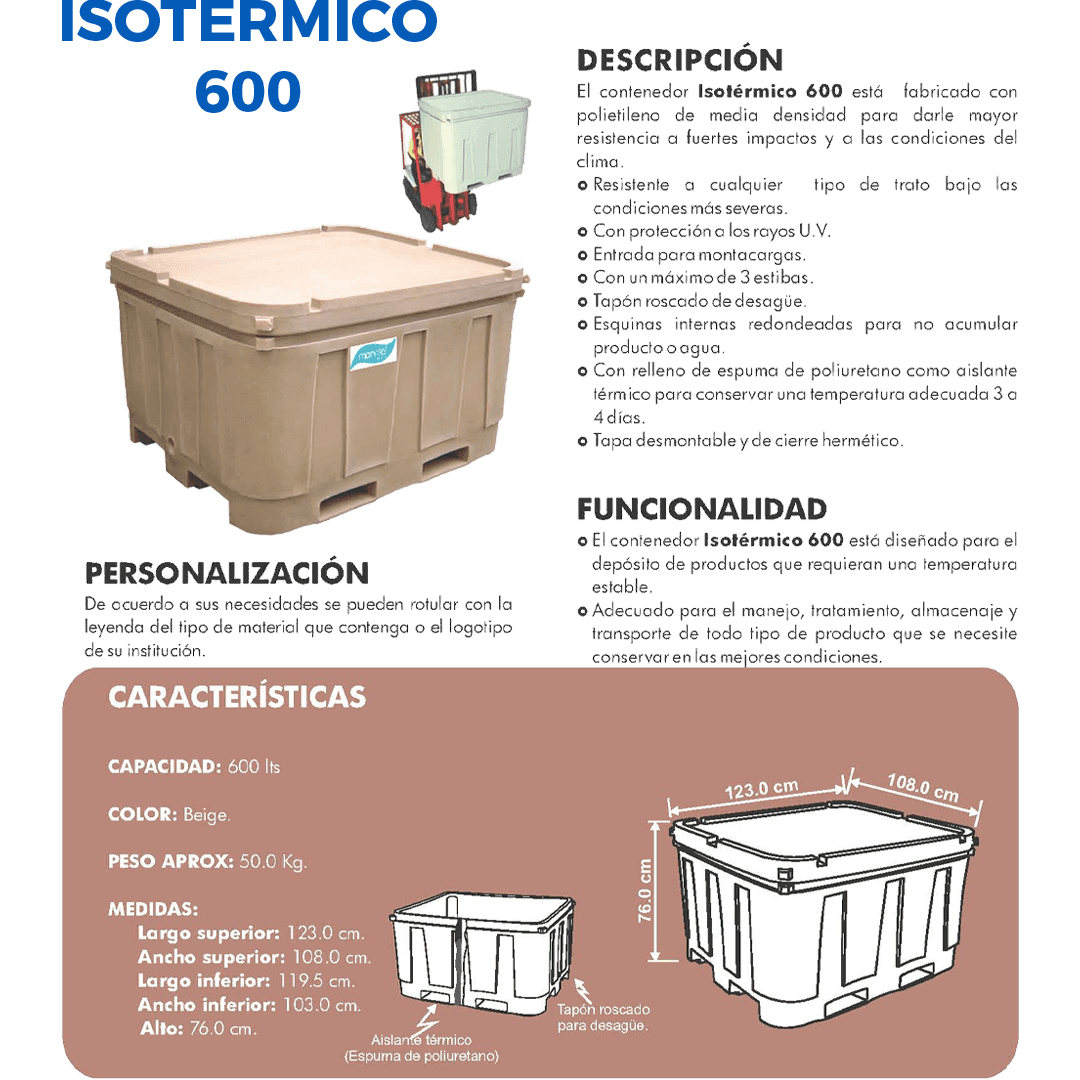 Descripción: Contenedor fabricado en polietileno de media densidad con interior de poliuretano, tapa de cierre hermético y desagüe. Interiores redondeados, apilable hasta tres estibas máximo. Capacidad volumen: 600 litros. Color: Beige. Largo: 123.0 cm. Ancho: 108.0 cm. Alto: 76.0 cm.