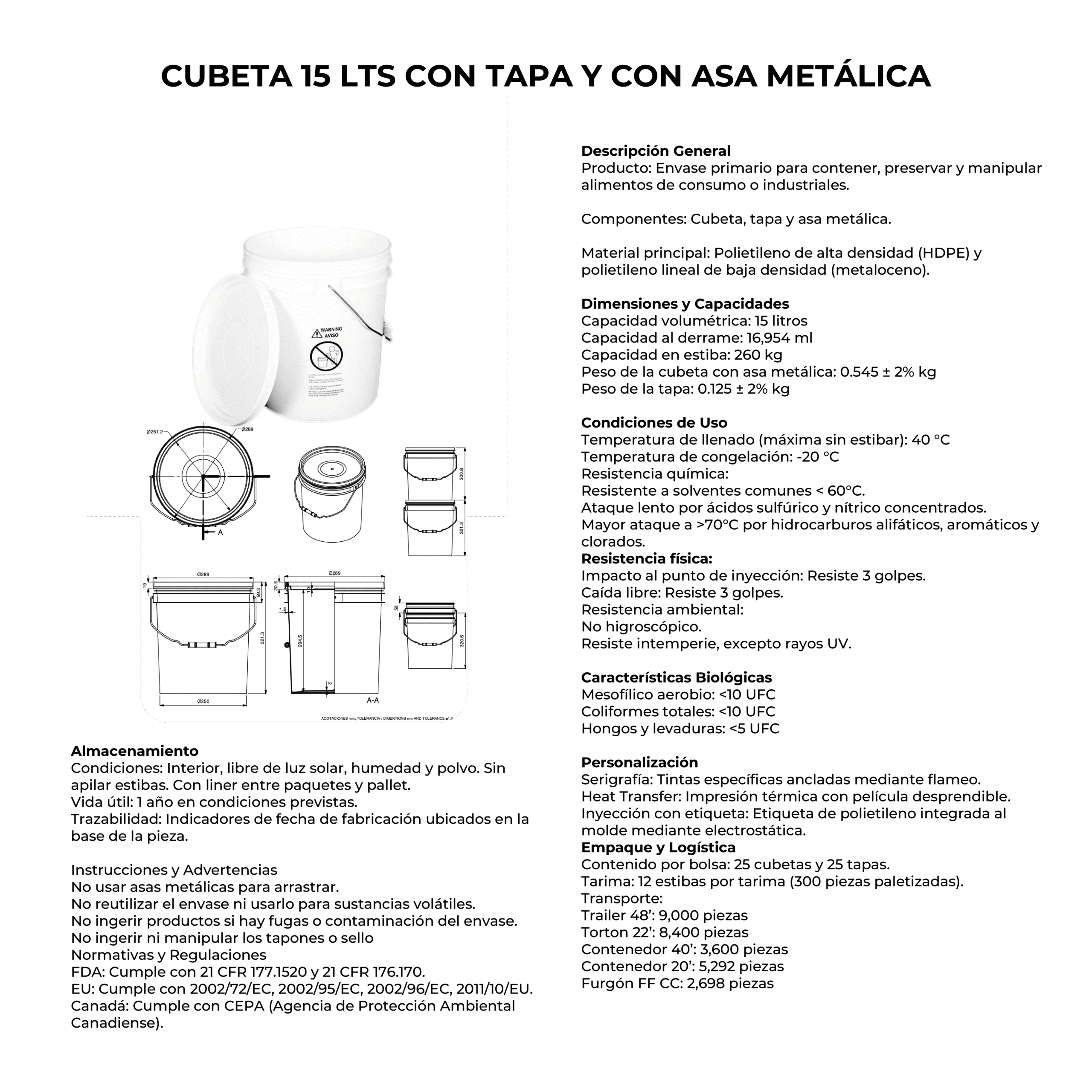 Cubeta de plástico fabricada en polietileno de alta densidad virgen (HDPE). Altura: 23.13 cm. Medida superior: 28.855 cm. Medida inferior: 24.86 cm. Peso: 0.49 kg. Capacidad interior: 15 l. Cubeta de plástico sin tapa 15 l, grado alimenticio, ideal para almacenar y guardar materiales sólidos y líquidos. Fabricadas en polipropileno (PP) y polietileno de alta densidad (PEAD). Con tapa y con asa metálica. Color: blanco.