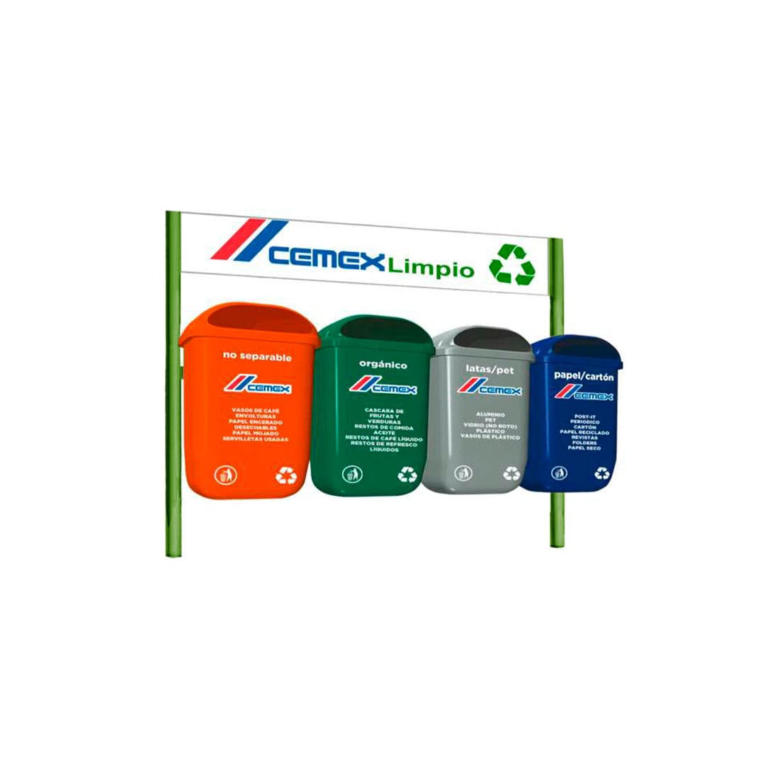Descripción: Capacidad por contenedor: 50 Lts. Color de contenedor: verde, gris, rojo amarillo y azul. Color de soporte: Verde. Medidas contenedor: Largo: 39.5 cm. Ancho: 25.0 cm. Alto: 74.0 cms. Medidas estación: Largo: 170.0 cm. Ancho: 30.0 cm. Alto: 130.0 cm. Capacidad total de reciclaje: 200 Lts Costo de personalización de logos y leyendas en vinil impresión Digital y vinil en contenedores de acuerdo a proyecto no incluido. Colores de contenedores a elegir.