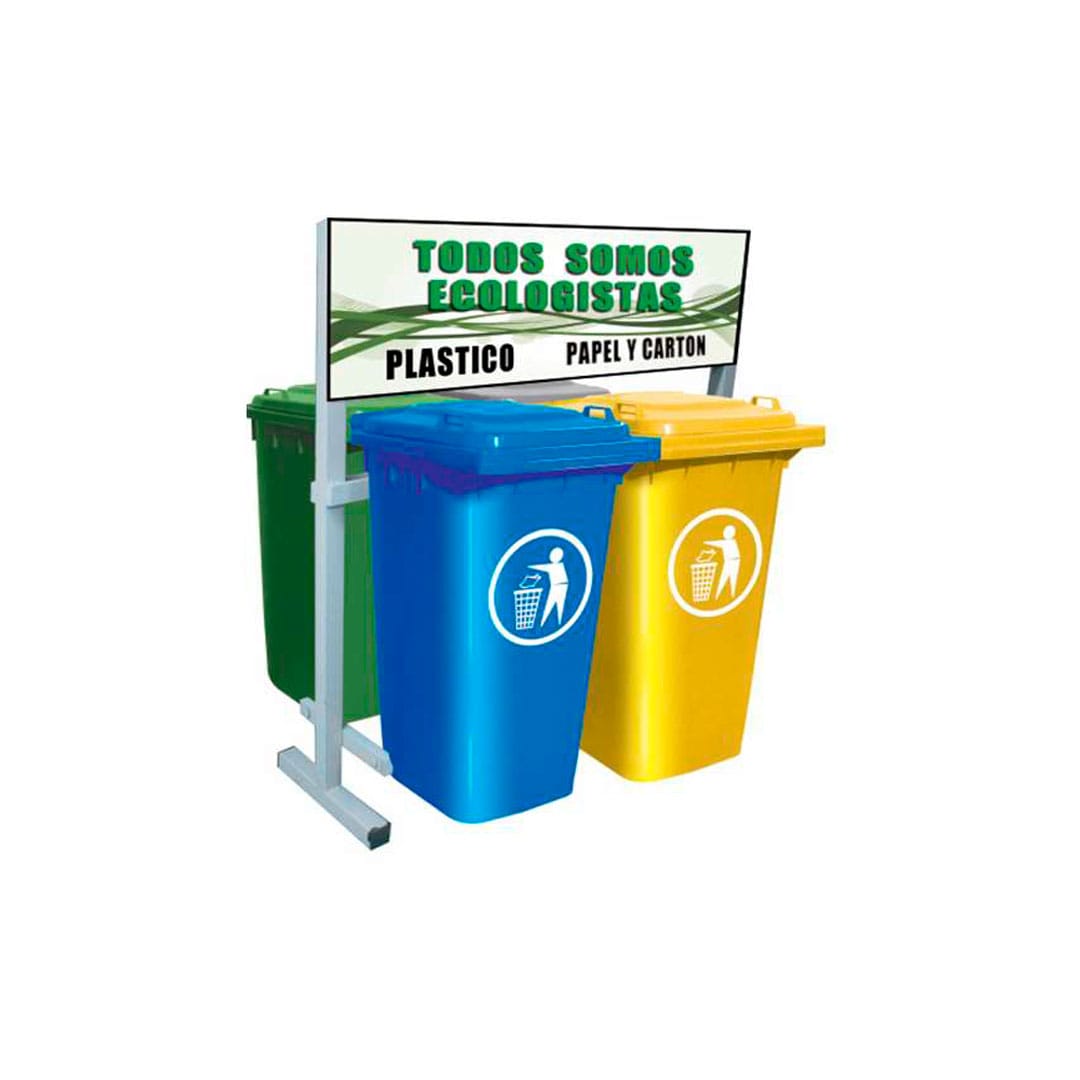 Descripción: Capacidad por contenedor: 240 lts.Colores del contenedor: Verde, gris, amarillo y azul. Medidas del contenedor: Largo 73.0 cm. Ancho 58.0 cm. Alto 108.0 cm. Color de soporte: Verde. Medidas estación: Largo: 110.0 cm. Ancho: 122.0 cm. Alto: 160.0 cm. Capacidad total de reciclaje 960lts. Espacio publicitario con una cara al frente. Costo de personalización de logos y leyendas en vinil impresión digital y vinil en contenedores de acuerdo a proyecto no incluido.