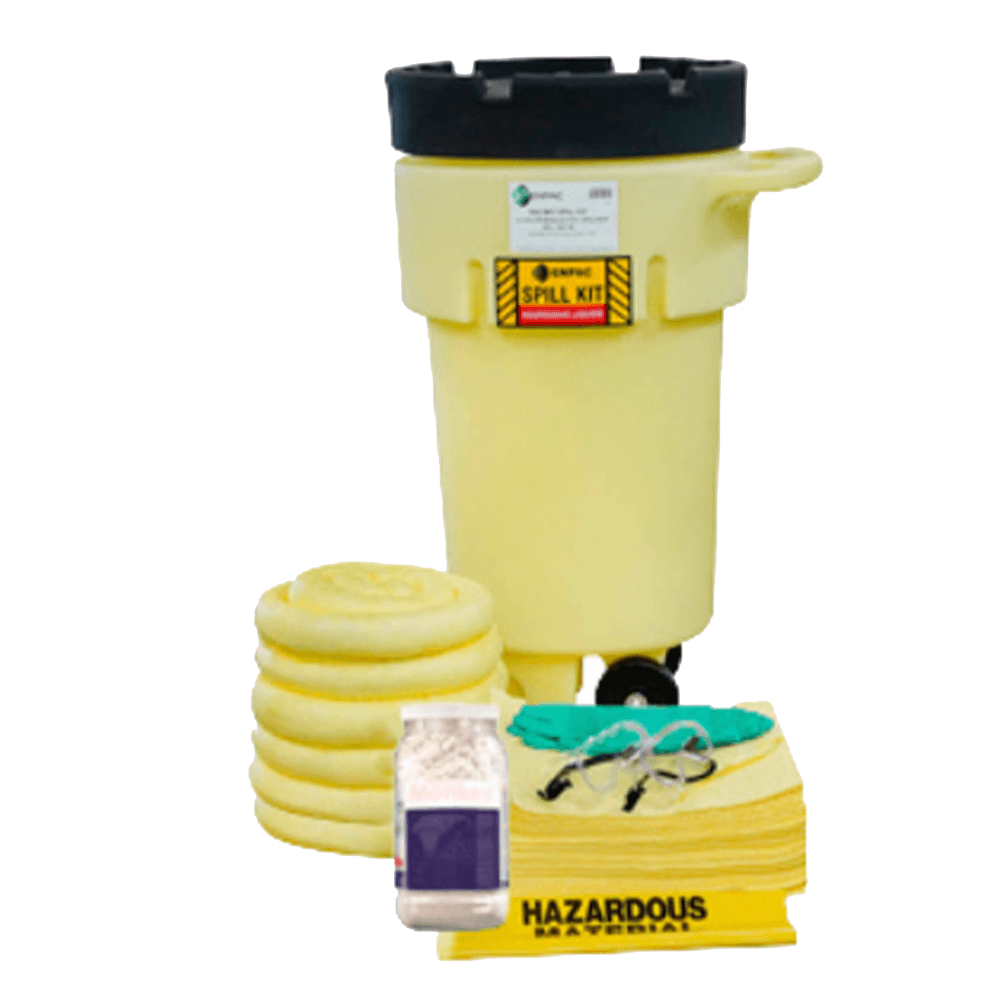 peligrosos como ácidos y cáusticos. Aprobado por Normas: 29 CFR 1910.1450(e), 40 CFR 112.7, 40 CFR 122.26, 40 CFR 263.30(a), 40 CFR 263.31, EPA, SPCC y NPDES. Incluye 40 toallas absorbentes, 5 calcetines absorbentes, 4 bolsas para Residuos Peligrosos, 2 guantes de Nitrilo, 2 goggles de seguridad, 1 absorbente granular y 1 Tambor de Salvamento (Poly SpillPack). Medidas: 61 x 74 x 115 cm. Peso: 25 Kg. Capacidad de absorbentes: 80 Lts. Capacidad del contenedor: 269 Lts.