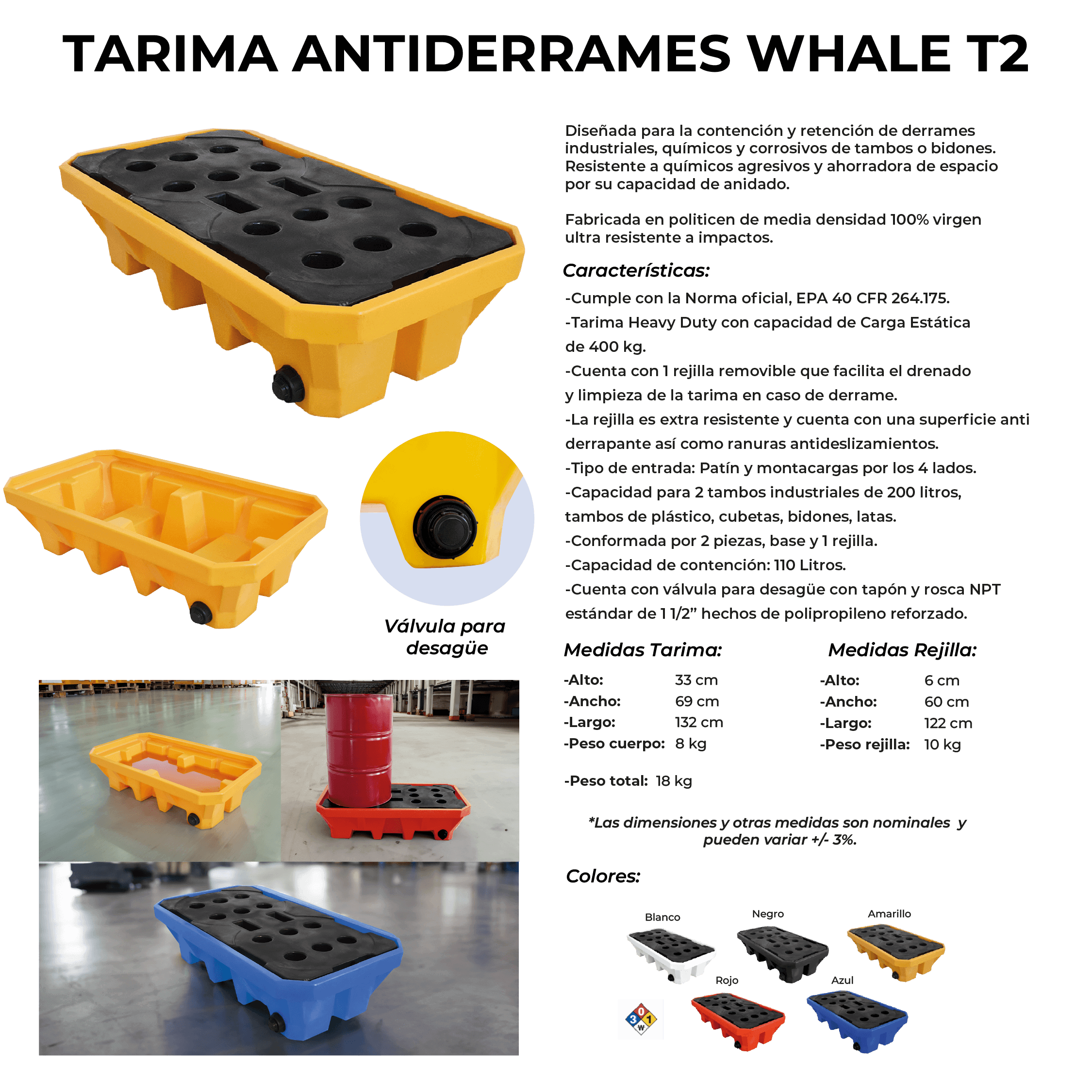 La tarima antiderrames Whale T2 está diseñada para la contención de derrames industriales, químicos y corrosivos de tambos o bidones. Cumple con la norma EPA 40 CFR 264.175 para contención secundaria. Fabricada en polietileno de media densidad 100% virgen. Habilitada para patín y montacargas. Las rejillas cuentan con ranuras antideslizamientos. Capacidad de contención: 110 Litros. Color: Amarillo. Medidas Tarima: Alto: 33.0 cm. Ancho: 69.0 cm. Largo: 132.0 cm. Medidas regilla: Largo: 122 cm. Ancho: 60.0 cm. Alto: 6.0 cm.